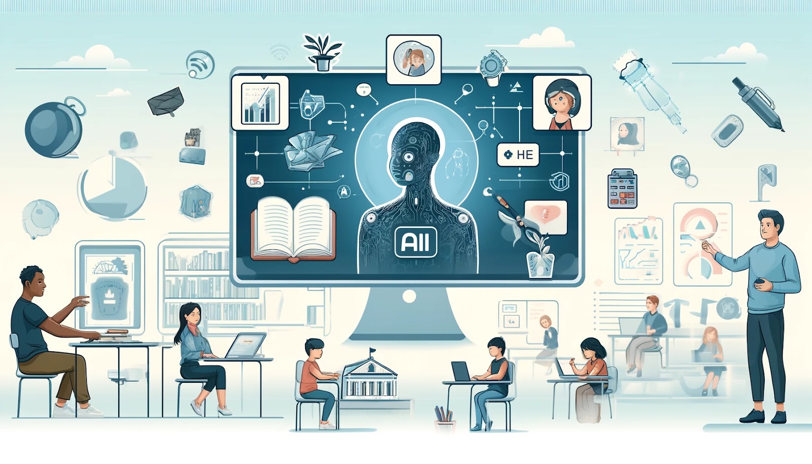 | Illustration of AI applications in education, including personalized learning and automated grading. |